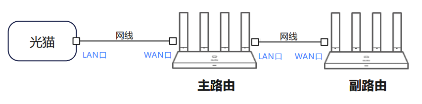 用网线连接主路由(母路由)的 LAN 口和副路由(子路由)的 WAN 口(若网口无单独的 WAN、LAN 标识或是带有 WAN/LAN 标识,则无需区分 WAN 口和 LAN 口),连接后即可自动完成组网。若副路由(子路由)的指示灯变为绿色/白色/蓝色常亮,则表示智联组网成功。